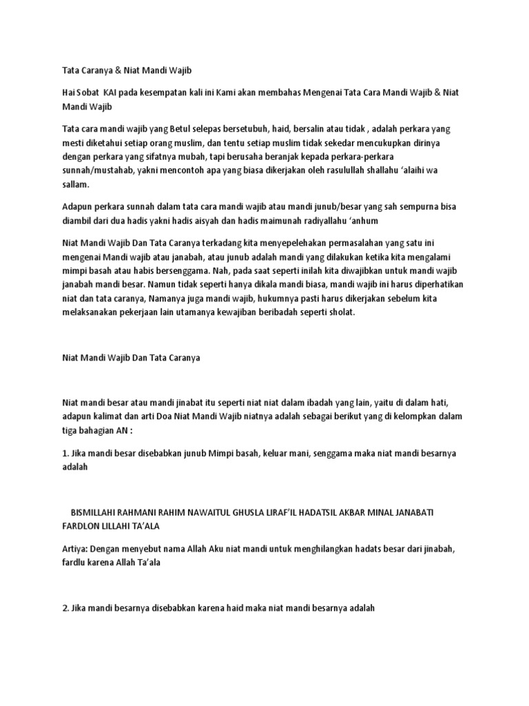 Ianya haruslah di lakukan dgn serentak. Mandi wajib ini juga sering disebut dengan mandi junub atau mandi besar. Tata cara mandi wajib merupakan sebuah tuntunan untuk kalian yang masih belum paham bagaimana cara melakukan mandi wajib secara benar dan 11 memakai sabun dan sampo. Doa mandi wajib, niat mandi besar dan tata cara mandi wajib yang benar kerap terlupakan oleh kaum muslimin. Kabar baiknya saat admin melihat pencarian di internet mengenai tata cara mandi wajib sangatlah banyak.
